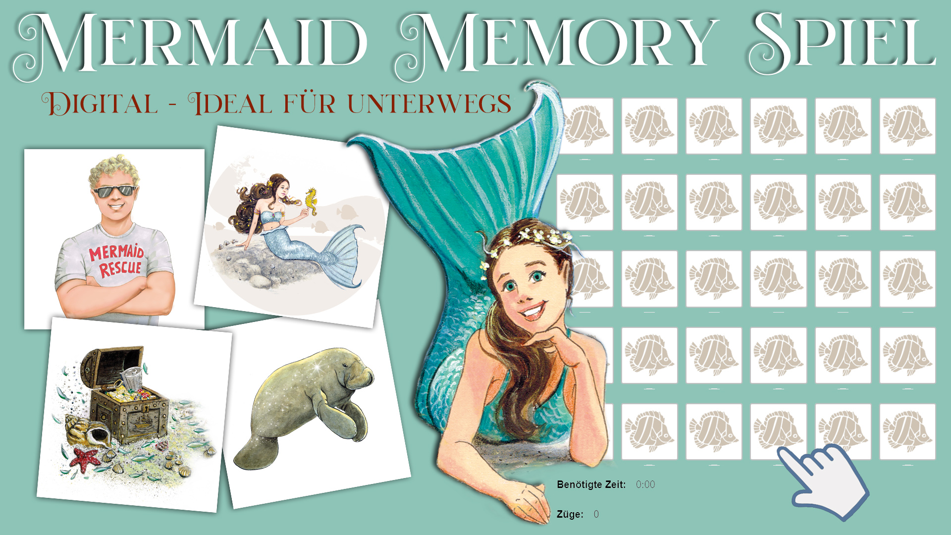 Viel Spaß beim Mermaid Memory-Spiel. Man kann es alleine oder zu mehreren spielen. Klicke unten eine Karte an und eine zweite Karte. Sind sie nicht identisch, dann klicke die nächste Karte an … usw.